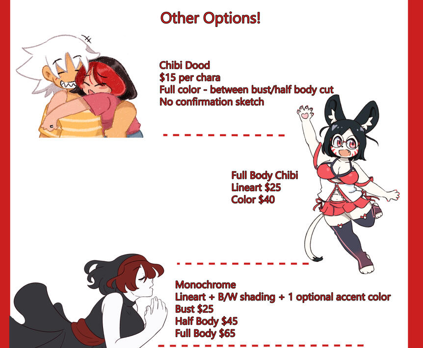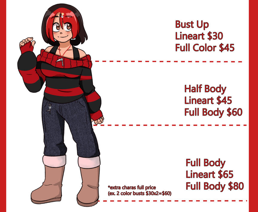Thanks for your interest in my commissions! Please read everything CAREFULLY before sending me an email!My prices are below.
